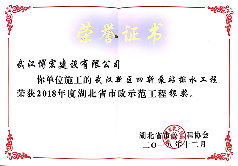 2018年度湖北省市政示范工程銀獎(四新泵站排水工程)