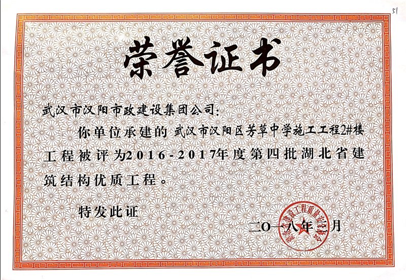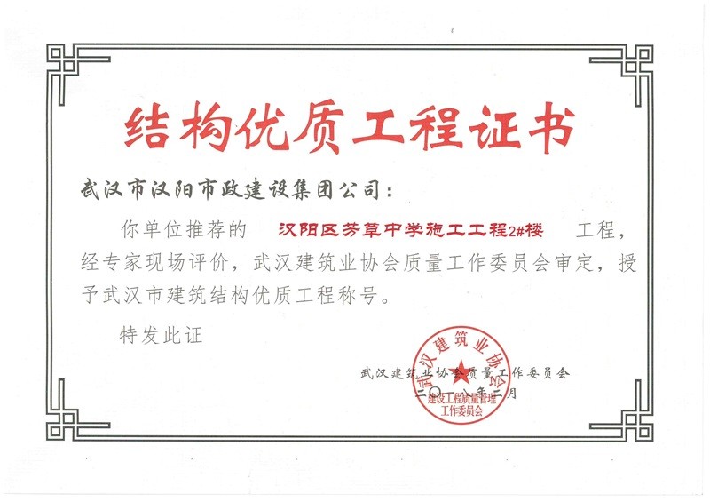 結構優(yōu)質工程證書(芳草中學綜合2號樓)
