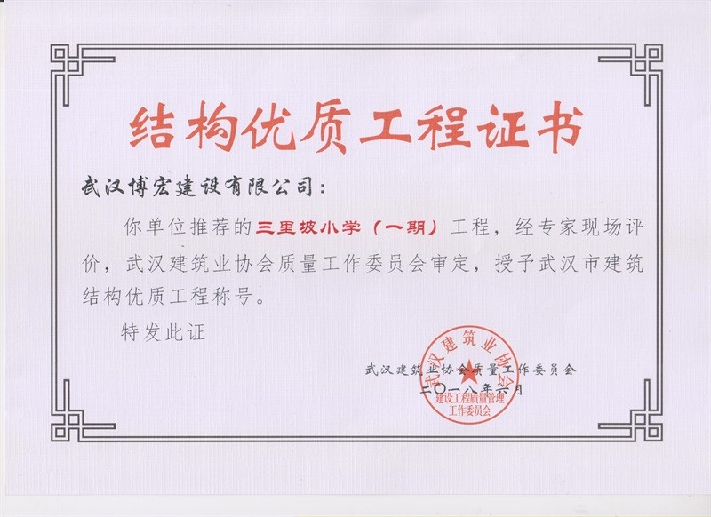 結構優(yōu)質工程證書(三里坡小學一期)