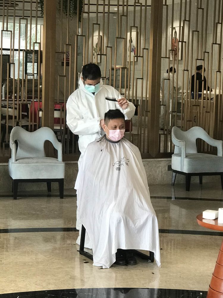 “麻煩幫我剪短點,再剪短點,兩個月沒理過發(fā)了,頭發(fā)從來沒這么長過!”3月8日上午10點,搬來幾張椅子、拿上幾把剪發(fā)器,“臨時理發(fā)店”在紐賓凱酒店大堂正式開業(yè)。