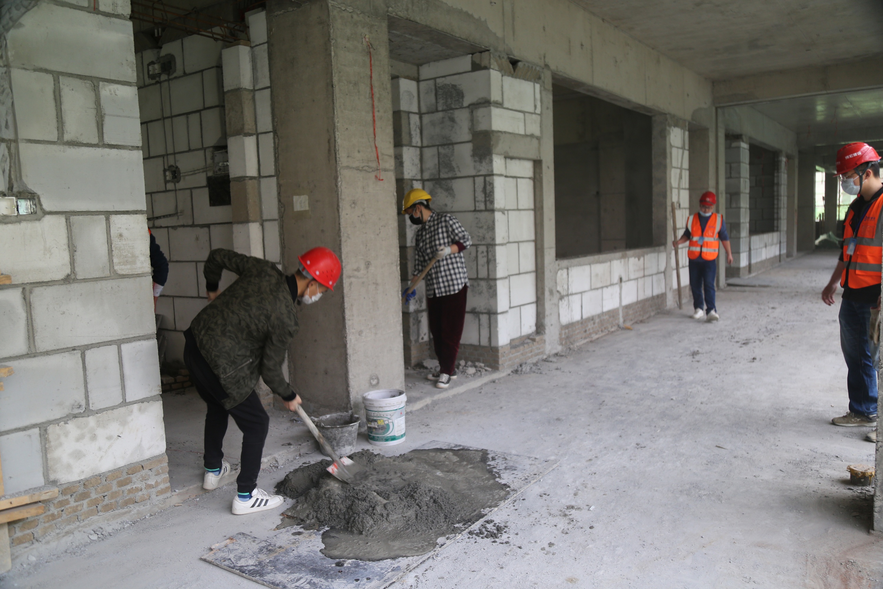 據(jù)項(xiàng)目負(fù)責(zé)人介紹,目前龍陽(yáng)中學(xué)項(xiàng)目已到崗工人60余人,當(dāng)下主要施工任務(wù)是部分樓棟進(jìn)行內(nèi)架拆除、砌體施工、水電安裝等。在經(jīng)過(guò)嚴(yán)格的場(chǎng)地消毒、進(jìn)場(chǎng)測(cè)溫和登記等防疫程序后,現(xiàn)場(chǎng)管理人員和工人們陸續(xù)進(jìn)場(chǎng),一進(jìn)場(chǎng)大家就忙活起來(lái)了,有的及時(shí)對(duì)地面凹陷進(jìn)行覆蓋,有的在上樓為墻面砌筑拌灰,旁邊樓棟里也傳來(lái)了“當(dāng)當(dāng)當(dāng)”的鋼管架子拆除聲音。大家對(duì)期盼已久的復(fù)工都干勁十足,項(xiàng)目起步就是沖刺,開(kāi)啟“白+黑”兩班倒模式,已連續(xù)兩個(gè)夜晚進(jìn)行施工,誓要把因疫情耽誤的工期盡快趕上。