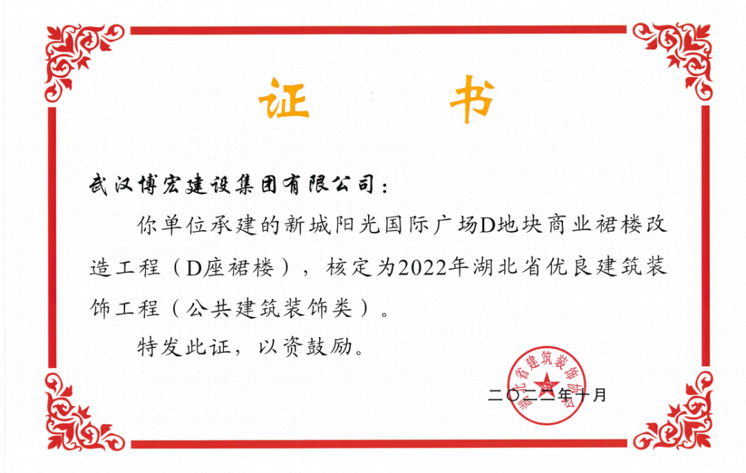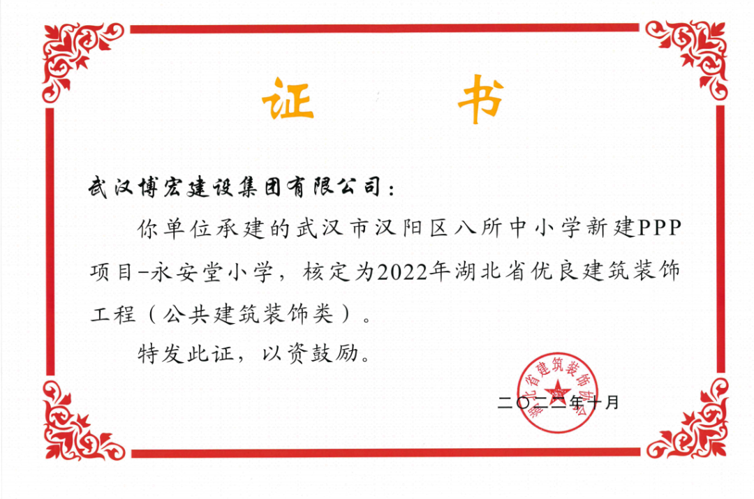 近日,湖北省建筑裝飾協(xié)會發(fā)布了《關(guān)于開展2022年湖北省建筑裝飾工程質(zhì)量目標考核工作的通知》,由博宏建設(shè)集團承建的華發(fā)四季等5所幼兒園裝修工程(EPC)、新城陽光國際廣場C地塊商業(yè)裙樓改造工程(1#、2#裙樓)、新城陽光國際廣場D地塊商業(yè)裙樓改造工程(D座裙樓)、武漢市漢陽區(qū)八所中小學新建PPP項目-永安堂小學被核定為“2022年湖北省優(yōu)良建筑裝飾工程(公共建筑裝飾類)”。