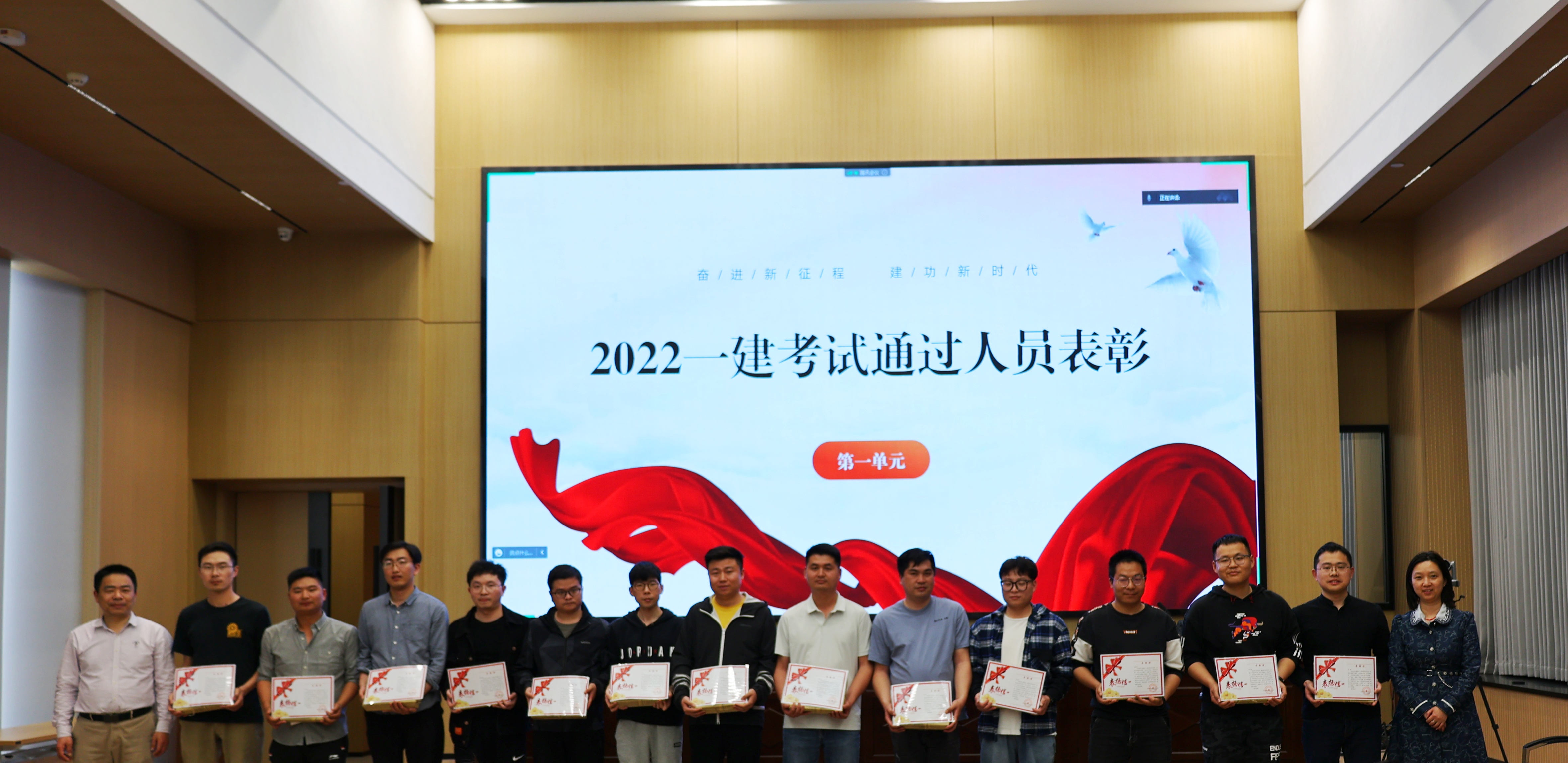 黨委副書(shū)記郭一清和本次合作培訓(xùn)機(jī)構(gòu)講師——鑫凌眾教育資深名師甘恢義老師為2022年度16名通過(guò)一建考試的學(xué)員頒發(fā)榮譽(yù)獎(jiǎng)品和表?yè)P(yáng)信。