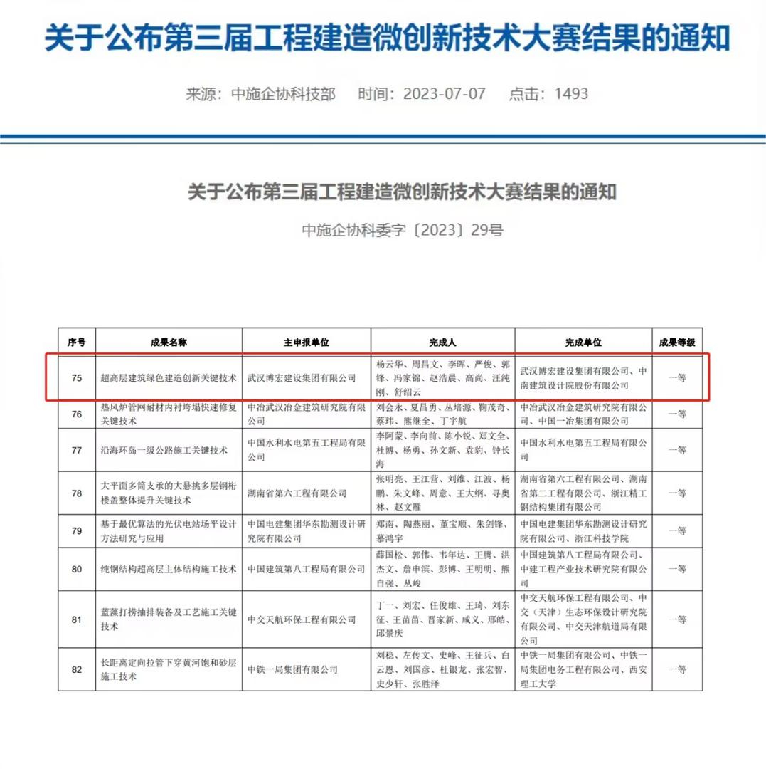 近日,中國施工企業(yè)管理協(xié)會(huì)公布第三屆工程建造微創(chuàng)新技術(shù)大賽獲獎(jiǎng)結(jié)果。以中南科研設(shè)計(jì)中心建設(shè)項(xiàng)目為背景的“超高層建筑綠色建造創(chuàng)新關(guān)鍵技術(shù)”榮獲中施企協(xié)第三屆工程建造微創(chuàng)新技術(shù)大賽一等成果,這也是博宏建設(shè)集團(tuán)首次獲得該類賽事一等獎(jiǎng)。